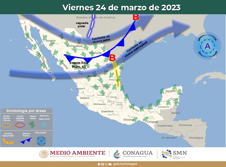 Mientras para el viernes 24 de marzo, se espera la aproximación de otro nuevo frente frío al territorio, lo que mantendrá la presencia de fuertes vientos en el estado, los cuales aumentarán de intensidad y podrán superar los 85 y 95 km/h en Riva Palacio, Majalca, Bachiniva, Guerrero, Carichí, Cusihuiriachi, Gran Morelos y Cuauhtémoc; para el resto del estado los vientos oscilaran en los 45 hasta los 75 km/h.