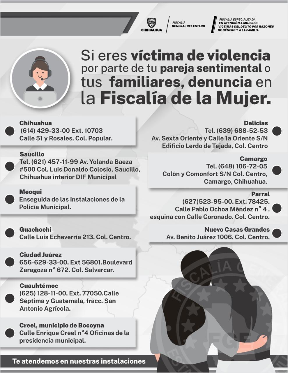En la FEM se brinda atención para la recepción de denuncias los 7 días de la semana, incluso en días festivos, además se mantiene la labor coordinada con el Centro de Justicia para las Mujeres en las ciudades de Chihuahua y Juárez, ya que ambas dependencias se encuentran en el mismo edificio.