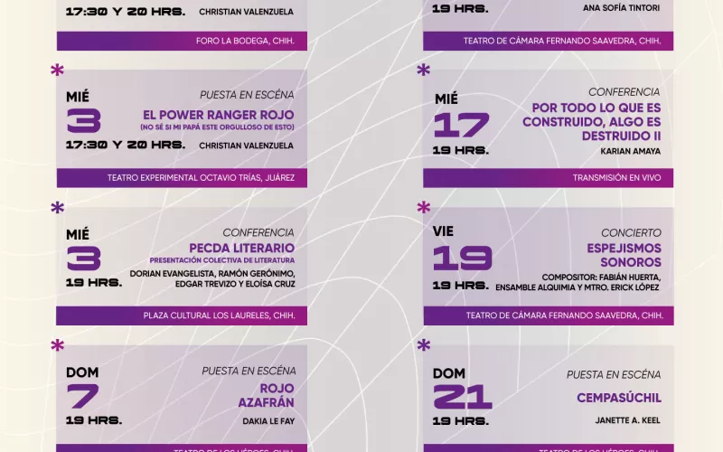 El domingo 21 a las 19:00 horas se presenta la obra de ballet “Cempasúchil”, en el Teatro de los Héroes de la ciudad de Chihuahua. A la misma hora del siguiente, en la Plaza Cultural Los Laureles será inaugurada la exposición colectiva de artes visuales de Carolina Domínguez, Isaí Martínez y Pavel Fernández.
