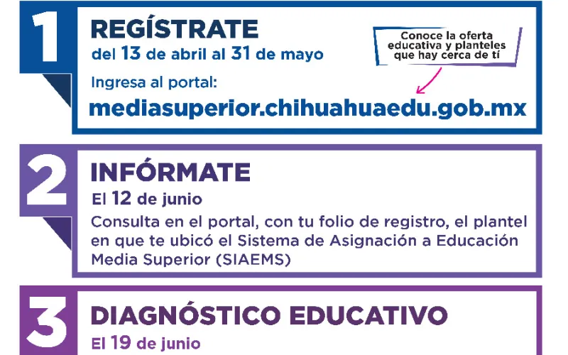 Del 13 de abril al 31 de mayo, el periodo de registro estará abierto a través de la página electrónica: https://mediasuperior.chihuahuaedu.gob.mx/, donde las y los aspirantes deberán seleccionar tres opciones de planteles que sean de su interés.