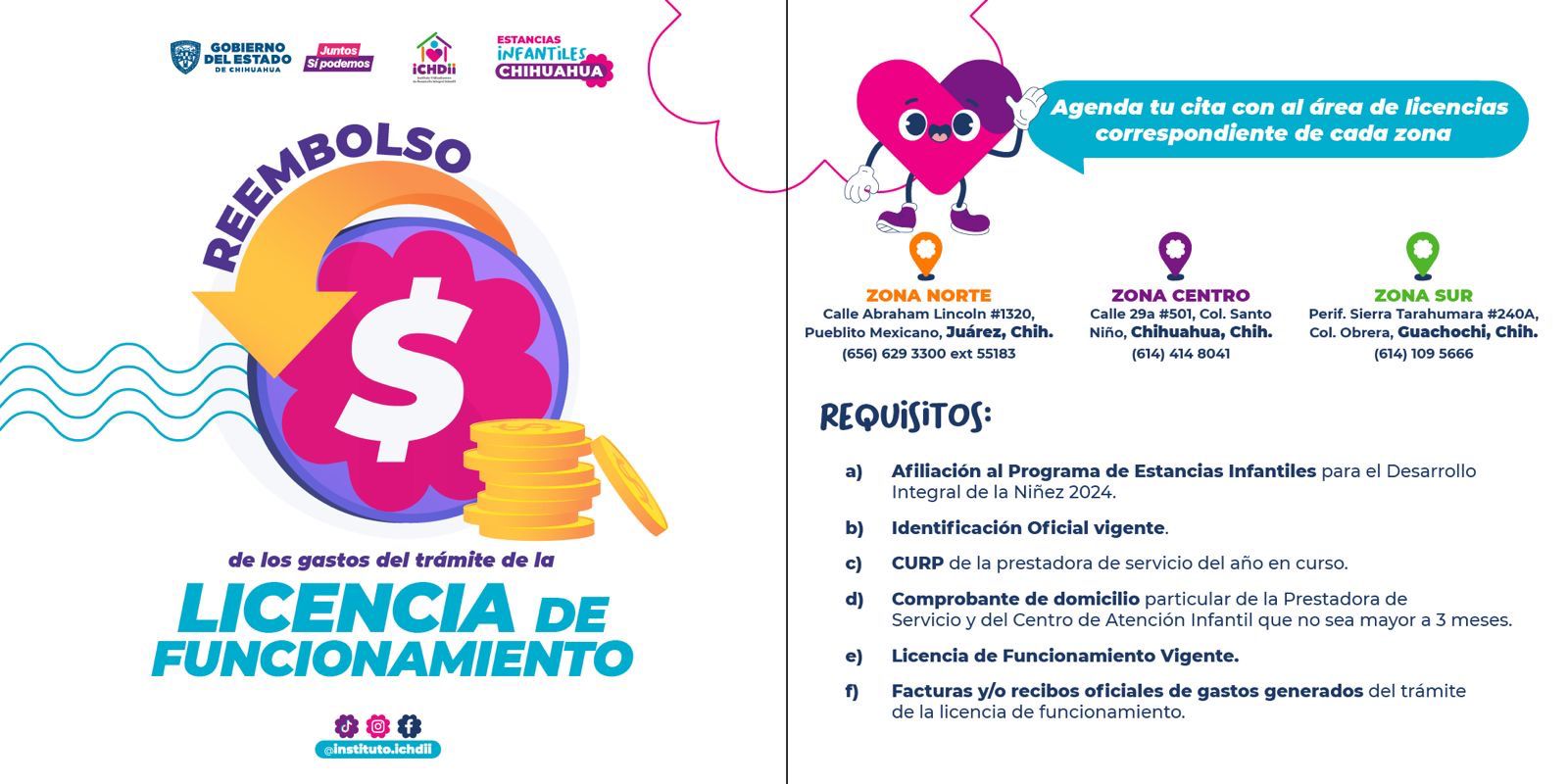 El Instituto Chihuahuense de Desarrollo Integral Infantil (Ichdii), informó a los afiliados al Programa de Estancias Infantiles para el Desarrollo Integral de la Niñez, sobre el proceso de reembolso de los gastos generados por el trámite de licencia de funcionamiento correspondiente a este año.