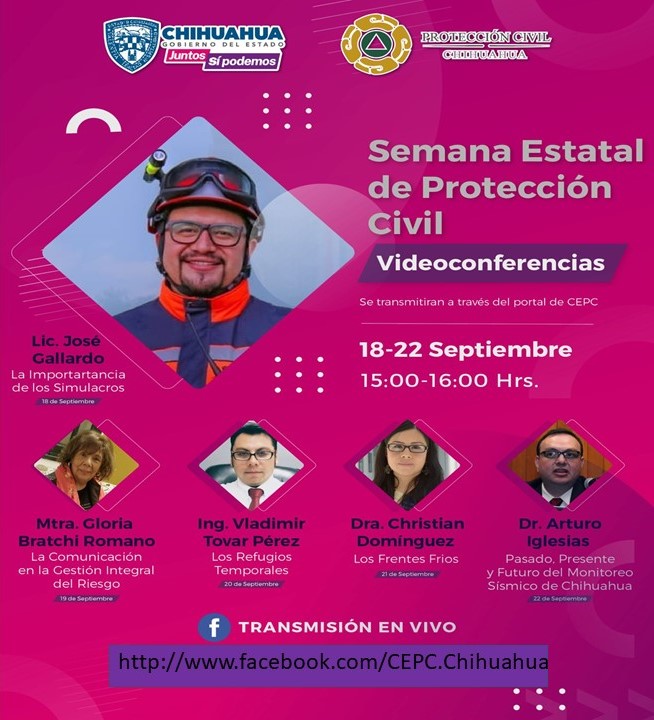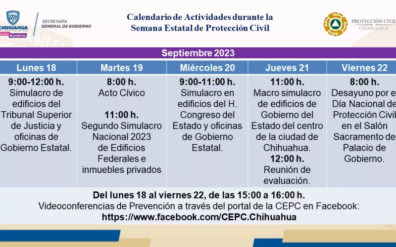 La Coordinación Estatal de Protección Civil Chihuahua (CEPC), invita a la población a participar en las actividades de la Semana Estatal de Protección Civil, que se llevará a cabo del 18 al 22 de septiembre.