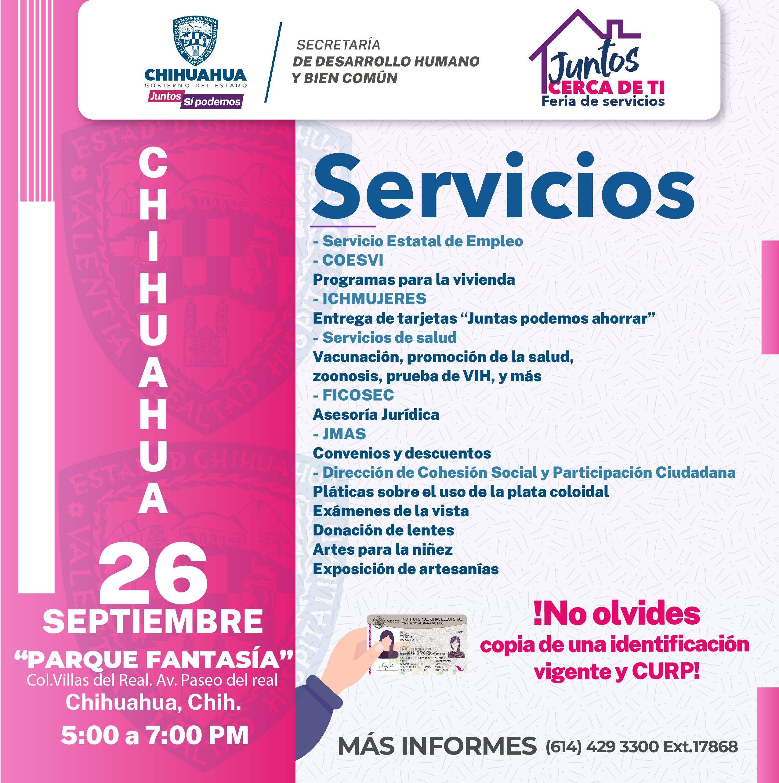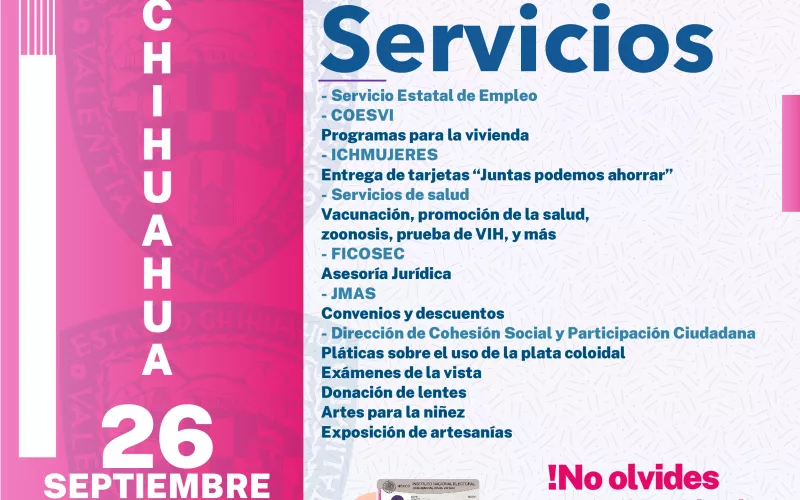 La Secretaría de Desarrollo Humano y Bien Común (SDHyBC) invita a la ciudadanía a aprovechar la feria de servicios gratuitos “Juntos Cerca de Ti”, que se instalará este martes 26 de septiembre a partir de las 17:00 horas en la colonia Villas del Real, en la ciudad de Chihuahua.