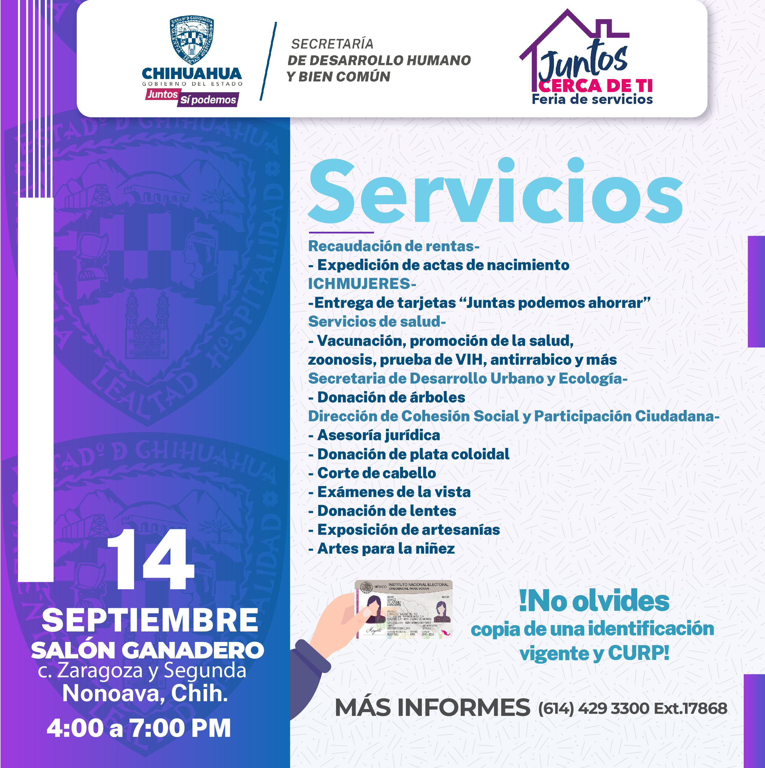 Con el objetivo de acercar los servicios que brinda el Gobierno del Estado a quienes más lo necesitan, la Secretaría de Desarrollo Humano y Bien Común (SDHyBC) invita a la feria “Juntos Cerca de Ti”, que se llevará a cabo el próximo jueves 14 de septiembre en el municipio de Nonoava.