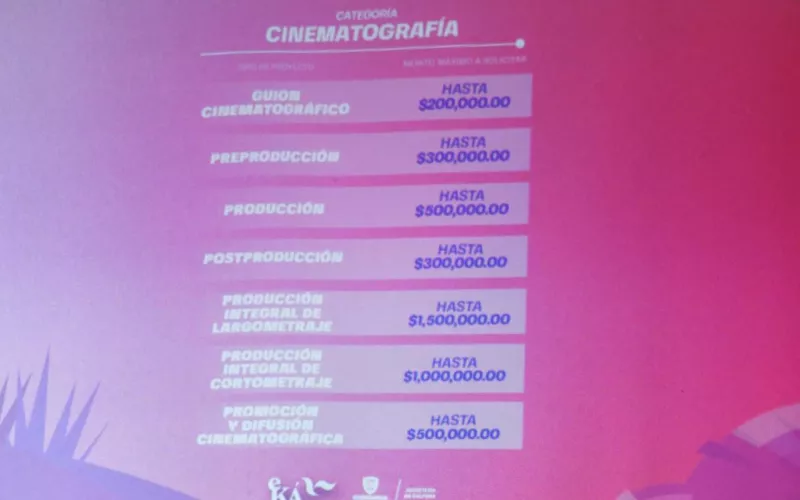 Para Cinematografía se podrán presentar proyectos de Guion cinematográfico, Preproducción, Producción, Postproducción, Producción integral de largometraje, Producción integral de cortometraje y Promoción y difusión cinematográfica.
