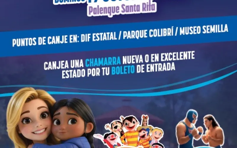 Con un espectáculo del Consejo Mundial de Lucha Libre, el show infantil de Bely y Beto y un Tributo a Selena, el DIF Estatal invita a los chihuahuenses a asistir al primer Chamarratón “Juntos contra el Frío”, este domingo 19 de octubre en el Palenque de la Feria de Santa Rita.