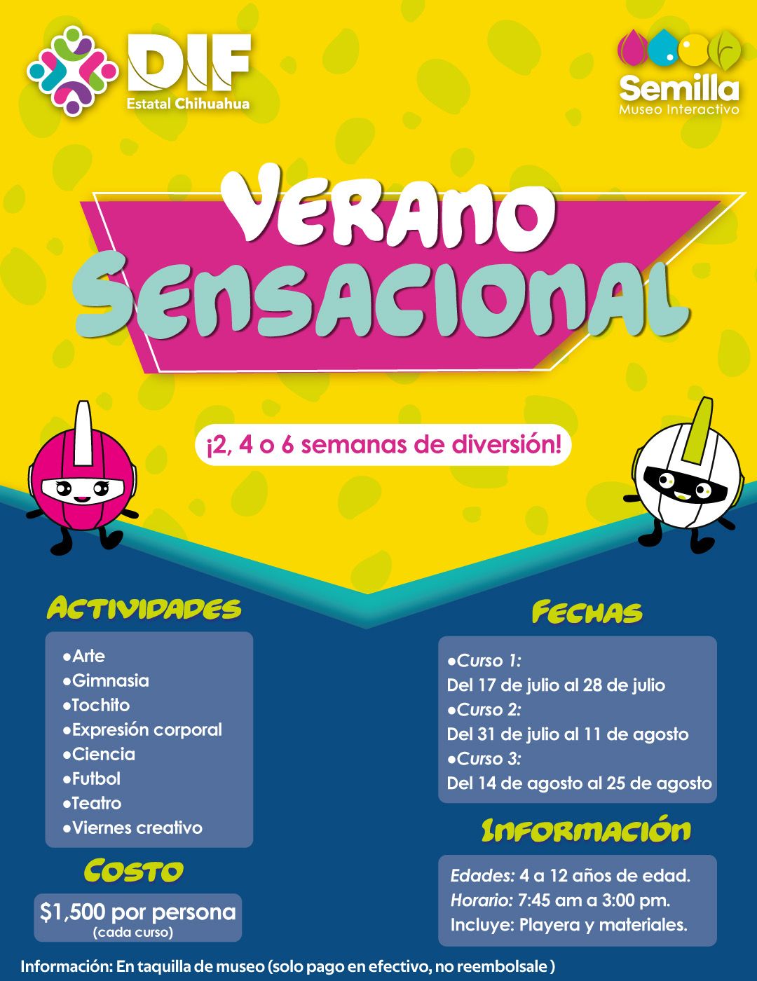 Verano Sensacional, se dividirá en tres fechas: Del 17 al 28 de julio, del 31 de julio al 11 de agosto y, del 14 al 25 de agosto; el costo es de mil 500 pesos (incluye playera y material), por persona en edades de entre 4 a 12 años.