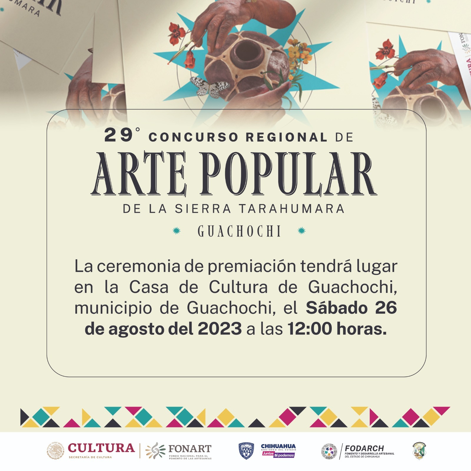 Fomento y Desarrollo Artesanal del Estado de Chihuahua (Fodarch), invita a la ciudadanía en general a acudir al 29° Concurso Regional de Arte Popular de la Sierra Tarahumara 2023, que tendrá lugar en Guachochi el sábado 26 de agosto a las 12:00 horas.
