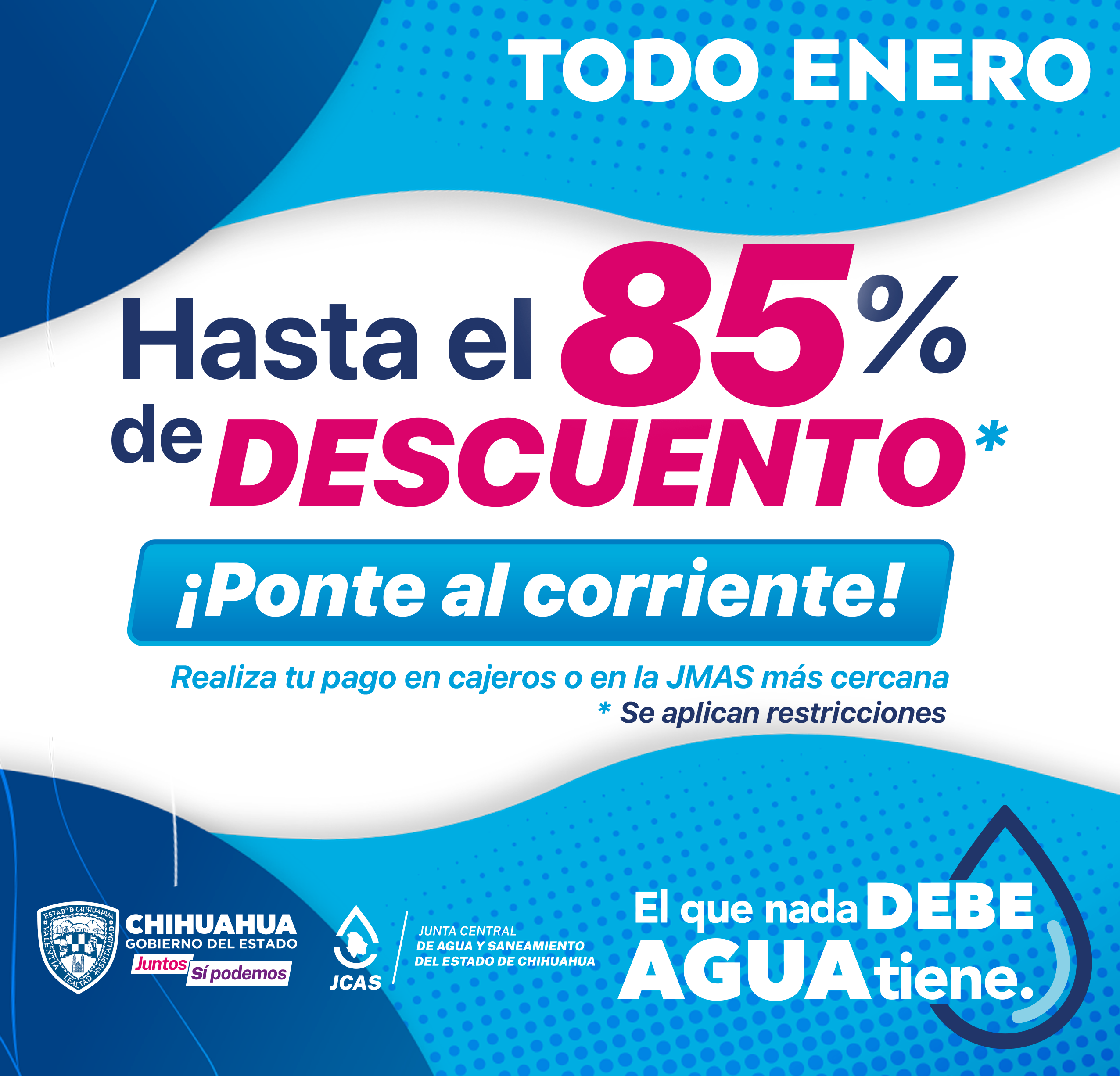 La Junta Central de Agua y Saneamiento (JCAS) anuncia que, el programa "El que Nada Debe, Agua Tiene" continúa ofreciendo sus beneficios con descuentos en adeudos, durante el mes de enero.