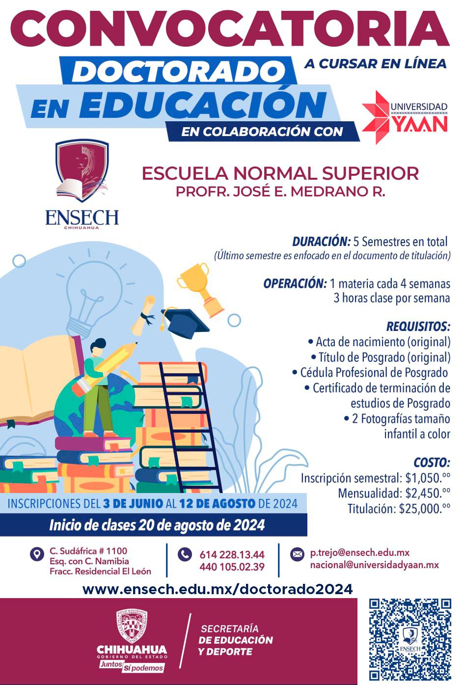 El proceso de inscripción se mantiene abierto hasta el 12 de agosto y para mayor información sobre los requisitos de ingreso, las personas interesadas pueden ingresar a la pagina Web www.ensech.edu.mx/doctorado2024 o a los números telefónicos 6142281344 o 4401050239.