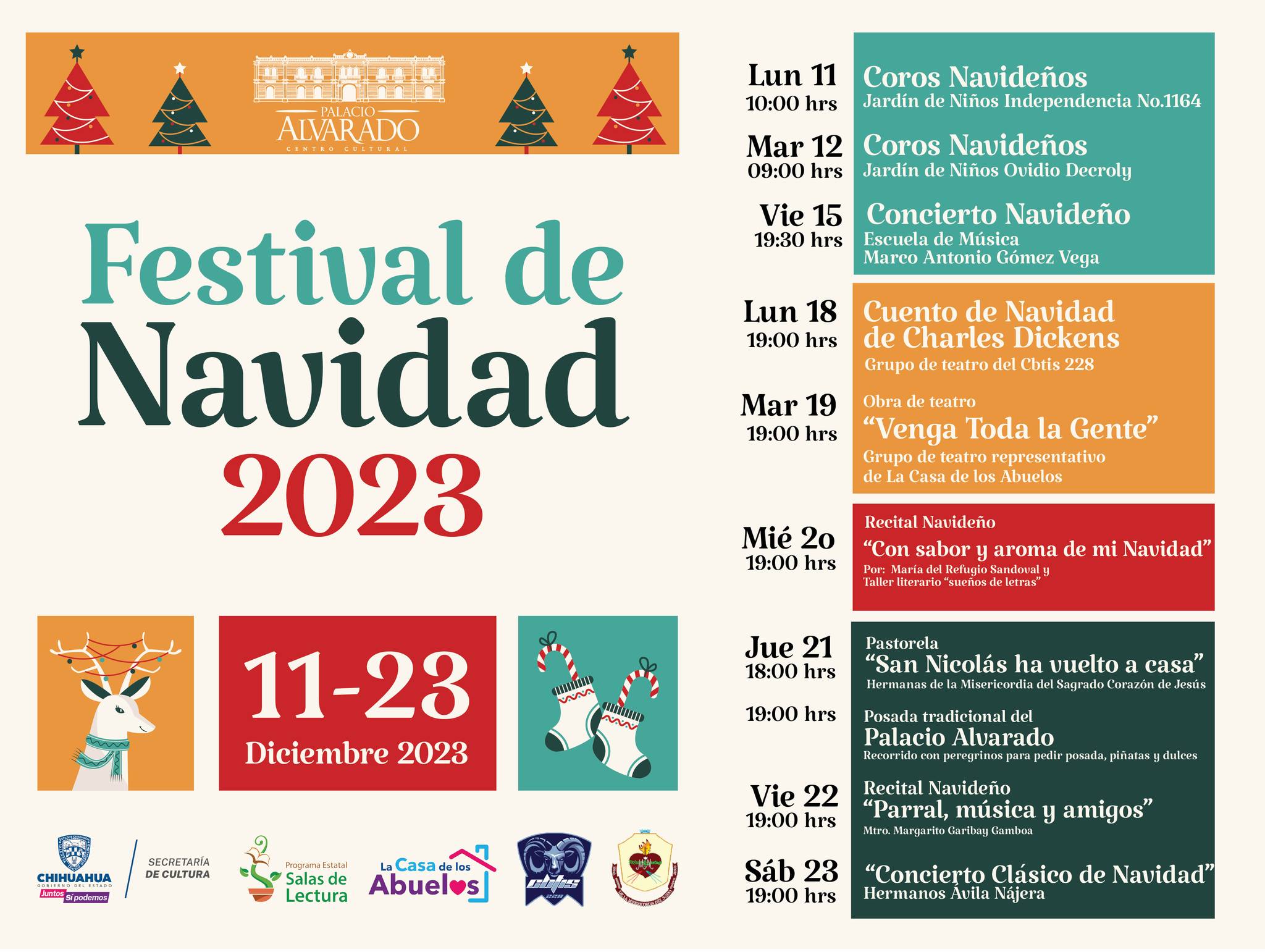 La Secretaría de Cultura invita a las actividades que se realizarán con motivo de las fiestas decembrinas, en el Centro Cultural Palacio Alvarado de Hidalgo del Parral, en donde se ofrecerán coros navideños, conciertos, cuenta cuentos, recitales y puestas en escena.
