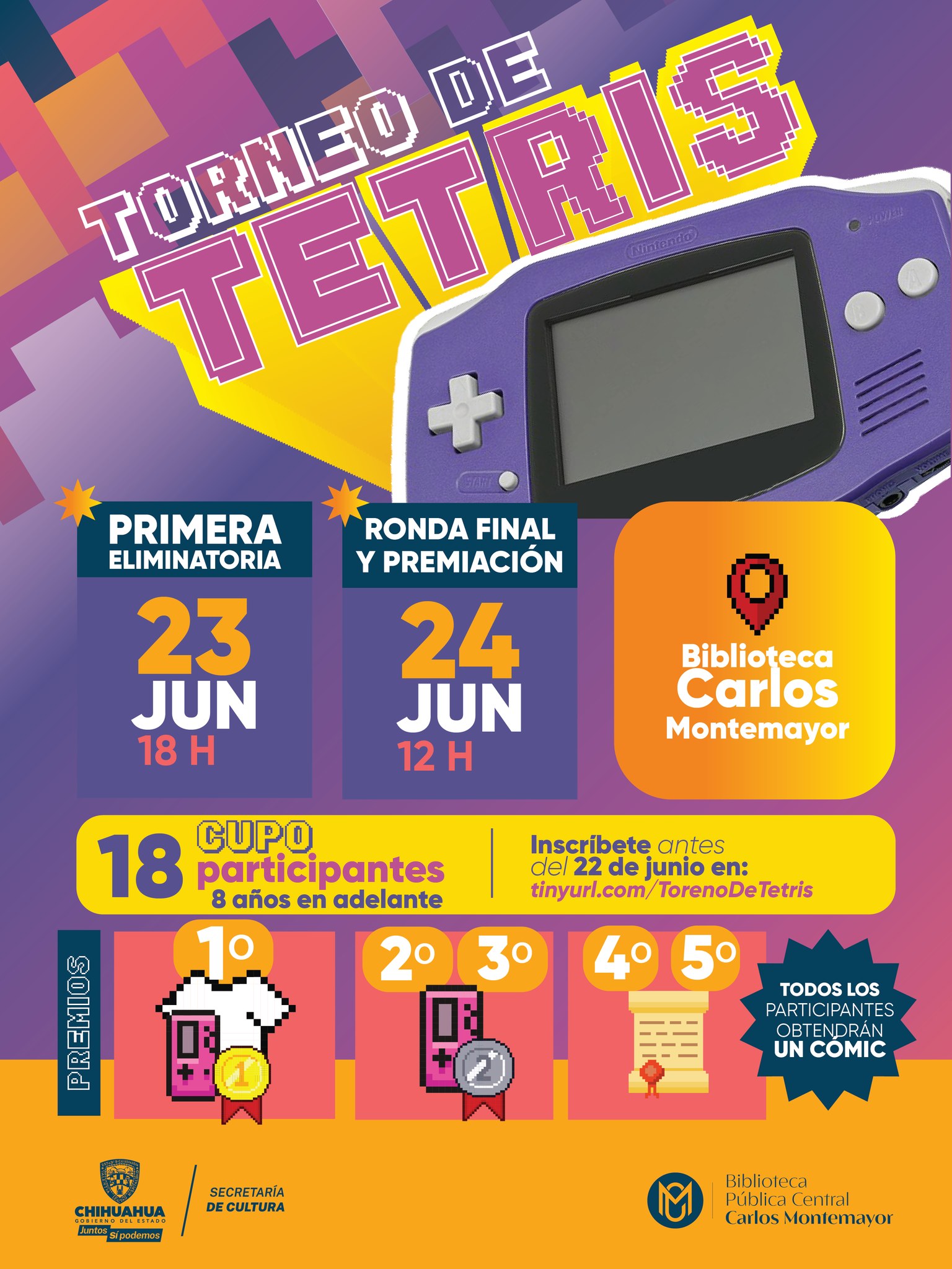 Con el objetivo de ofrecer un programa permanente de actividades en las bibliotecas del estado, la Secretaría de Cultura realizará el “Primer Torneo de Tetris”, que se llevará a cabo en el marco del aniversario del lanzamiento de este tradicional videojuego los días 23 y 24 de junio.
