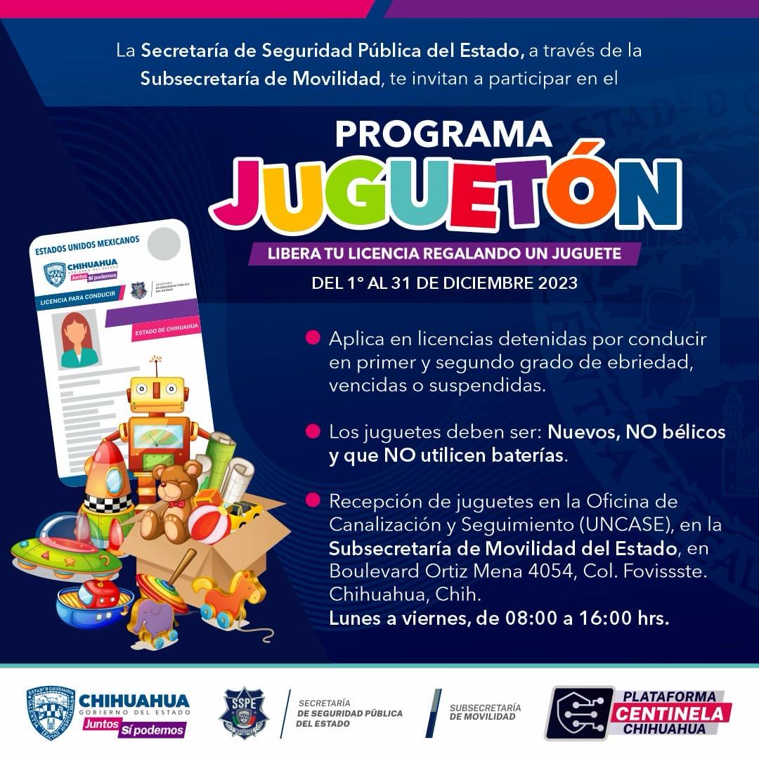 La Secretaría de Seguridad Pública del Estado, a través de la Subsecretaría de Movilidad, invita a la ciudadanía a participar en el “Programa Juguetón”, con el cual se podrán liberar licencias vencidas o retenidas, a cambio de un juguete.