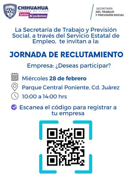 La Secretaría del Trabajo y Previsión Social (STPS), a través del Servicio Estatal de Empleo (SEE), invita todos aquellos empleadores de Ciudad Juárez con necesidades de contratación inmediatas a participar en la próxima Jornada de Reclutamiento, la cual se llevará a cabo el próximo miércoles 28 de febrero en las instalaciones del Parque Central Poniente.