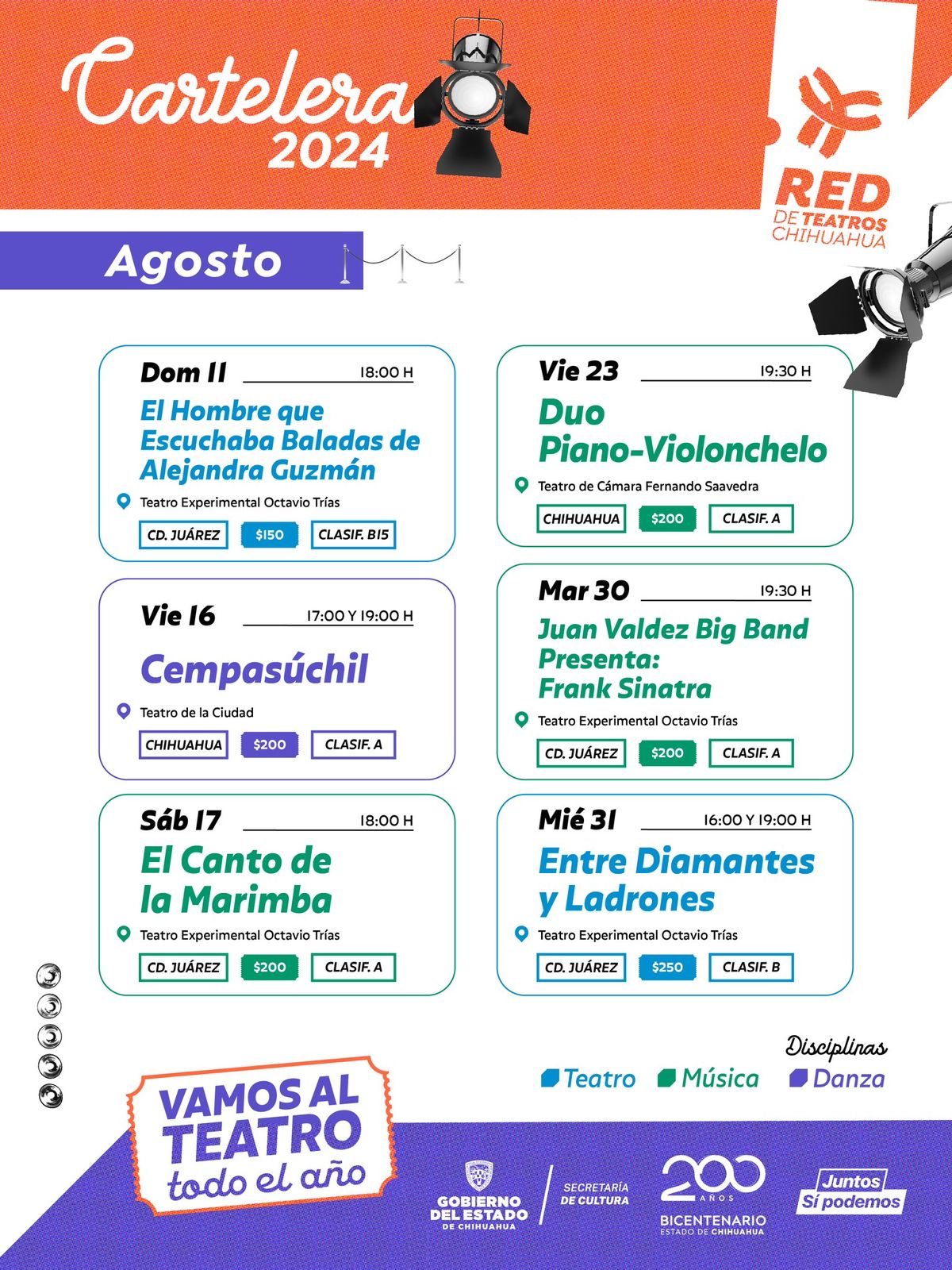 La Secretaría de Cultura invita a las y los chihuahuenses, a asistir a los diferentes eventos que se presentarán durante el mes de agosto en las ciudades de Juárez y Chihuahua, como parte del programa Red de Teatros 2024.