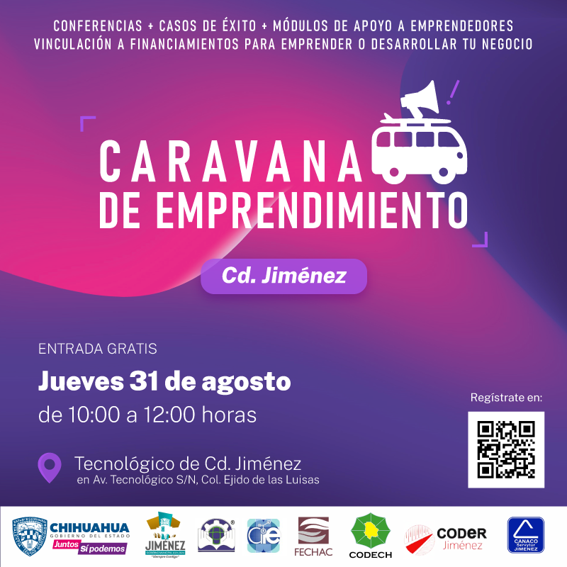 La Secretaría de Innovación y Desarrollo Económico (SIDE) y el Gobierno Municipal de Jiménez invitan a la Caravana de Emprendimiento que se realizará el próximo 31 de agosto en el Tecnológico de Ciudad Jiménez en un horario de 10:00 a 12:00 horas.