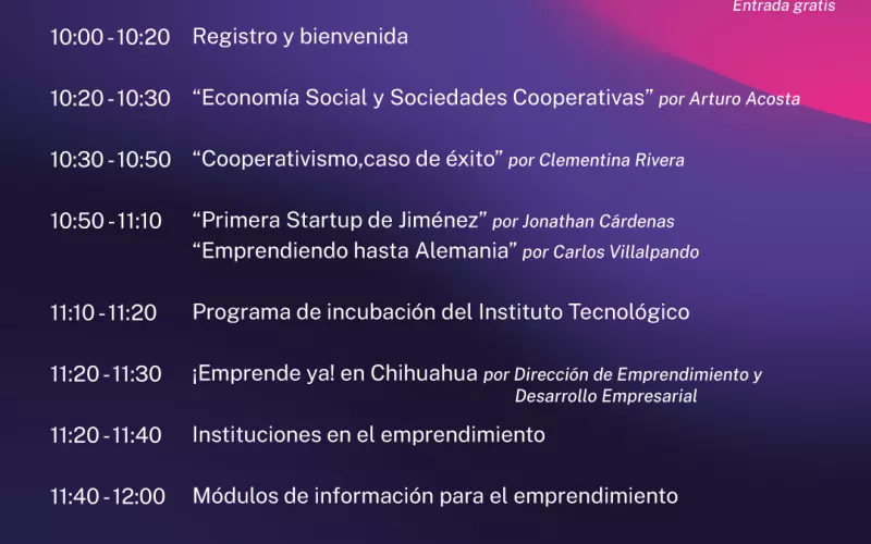 El programa incluye conferencias acerca de “Economía Social y Sociedades Cooperativas” impartida por Arturo Acosta; “Cooperativismo, caso de éxito” por Clementina Rivera; “Primera Startup de Jiménez” por Jonathan Cárdenas y “Emprendiendo hasta Alemania” por Carlos Villalpando.