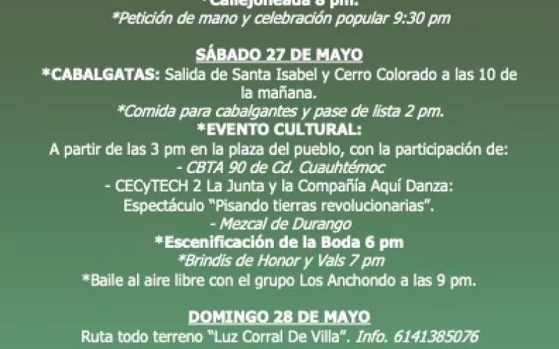 La Secretaría de Turismo de Chihuahua y el Ayuntamiento de Riva Palacio, dieron a conocer formalmente la programación de los eventos que formarán parte de la XIV escenificación de la Boda de Luz Corral y Francisco Villa, en el poblado de San Andrés, el próximo fin de semana.