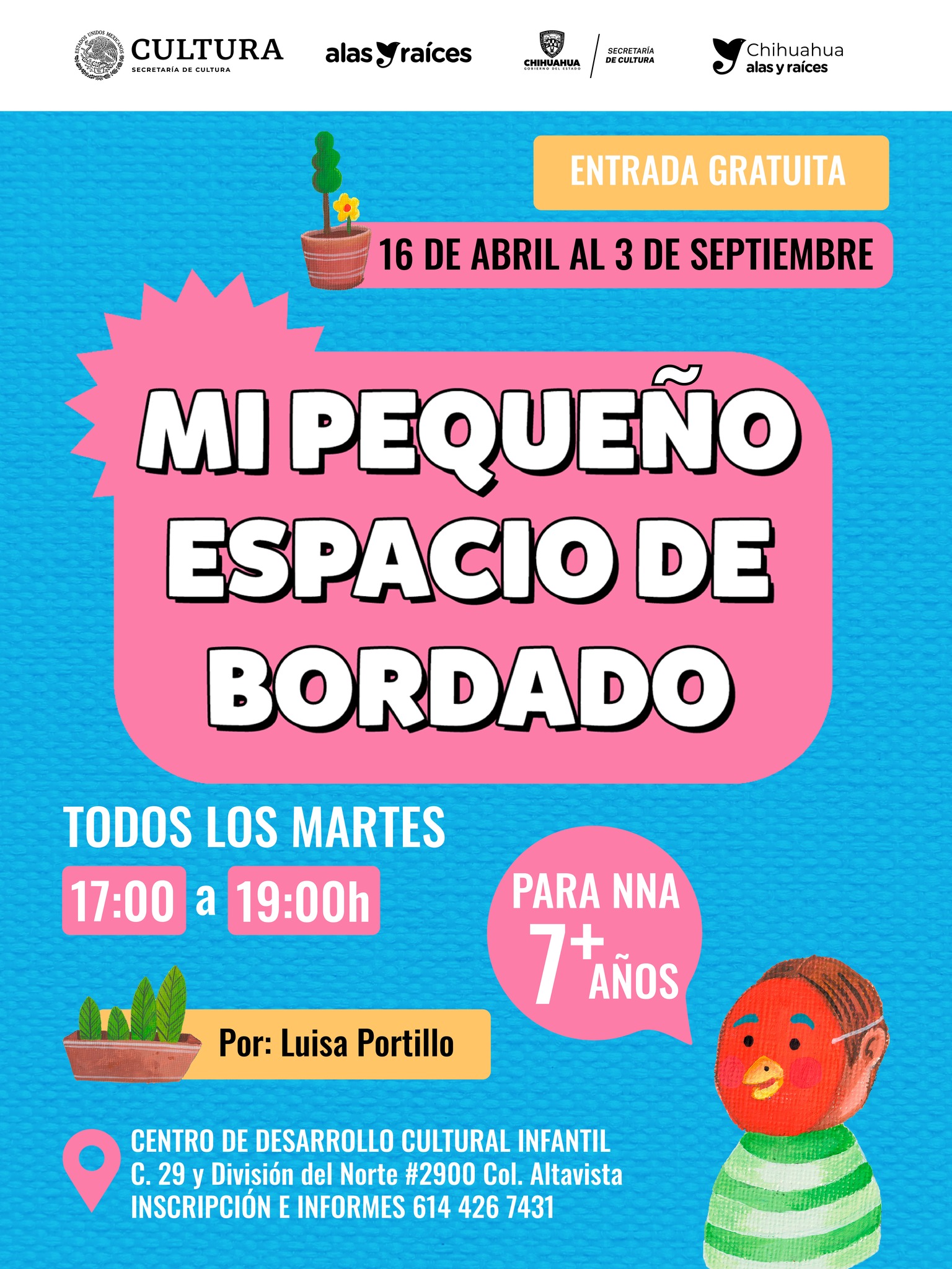 El Departamento de Desarrollo Comunitario y Públicos Específicos, de la Secretaría de Cultura, invita al taller infantil “Mi pequeño espacio de bordado”, que será impartido de forma gratuita por Luisa Portillo todos los martes, del 16 de abril al 3 de septiembre.