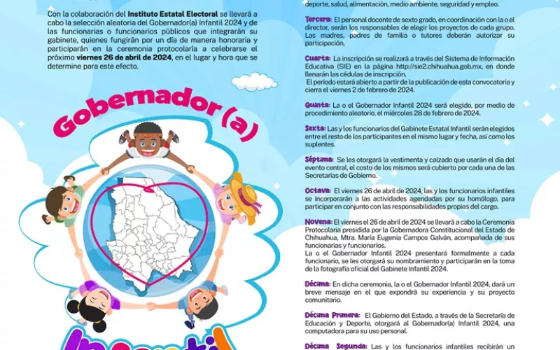 Con el firme propósito de promover y fomentar los valores cívicos, así como la participación democrática de la niñez chihuahuense, el Gobierno del Estado a través de la Secretaría de Educación y Deporte (SEyD), lanzó la convocatoria del concurso “Gobernador(a) Infantil 2024”, dirigida a estudiantes de sexto grado de primaria.