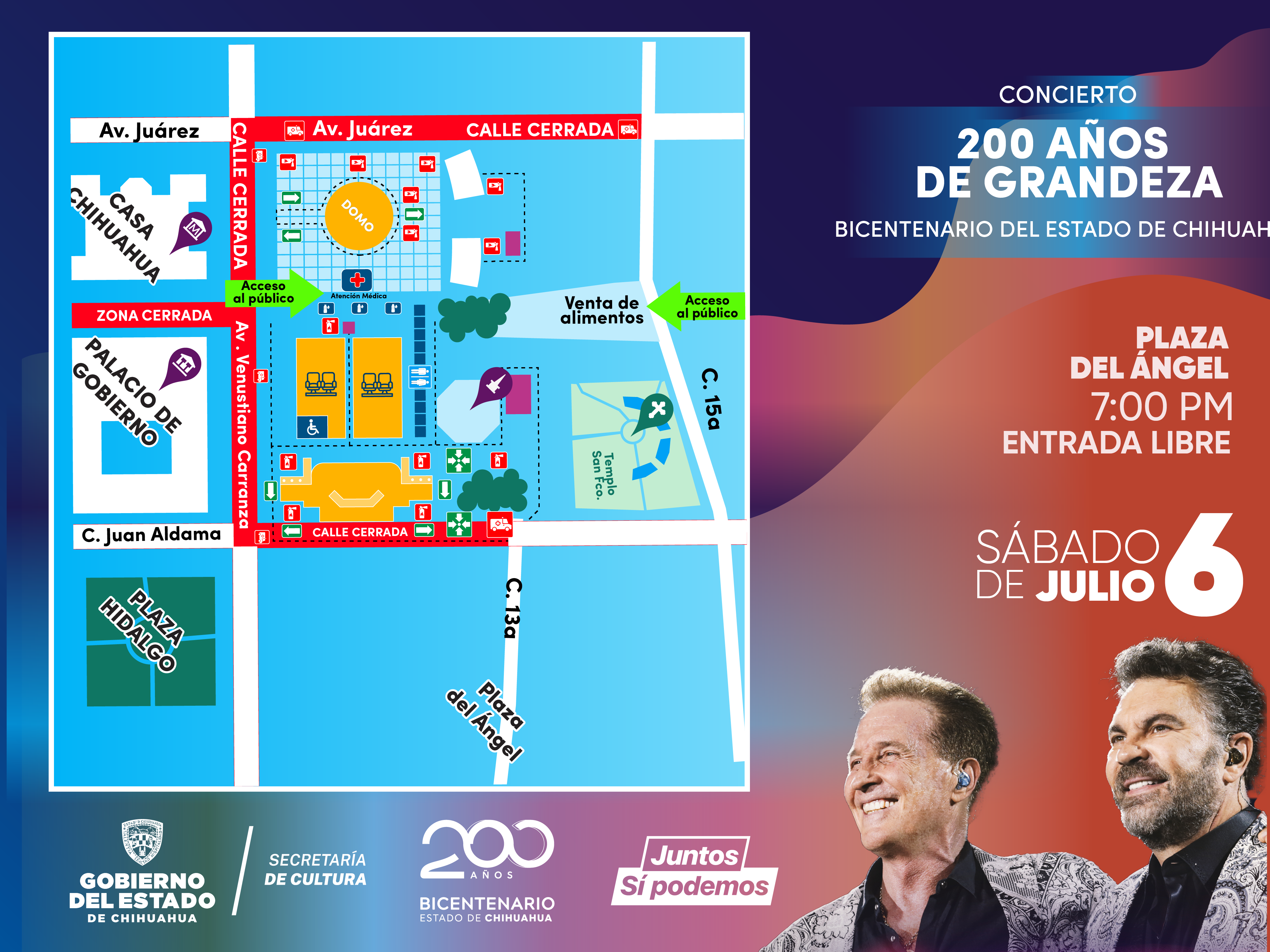 La Secretaría de Cultura informó que las calles que rodean la Plaza Mayor y la Plaza del Ángel, permanecerán cerradas a partir de las 15:00 horas del 6 de julio, debido al evento 200 Años de Grandeza Chihuahuense.