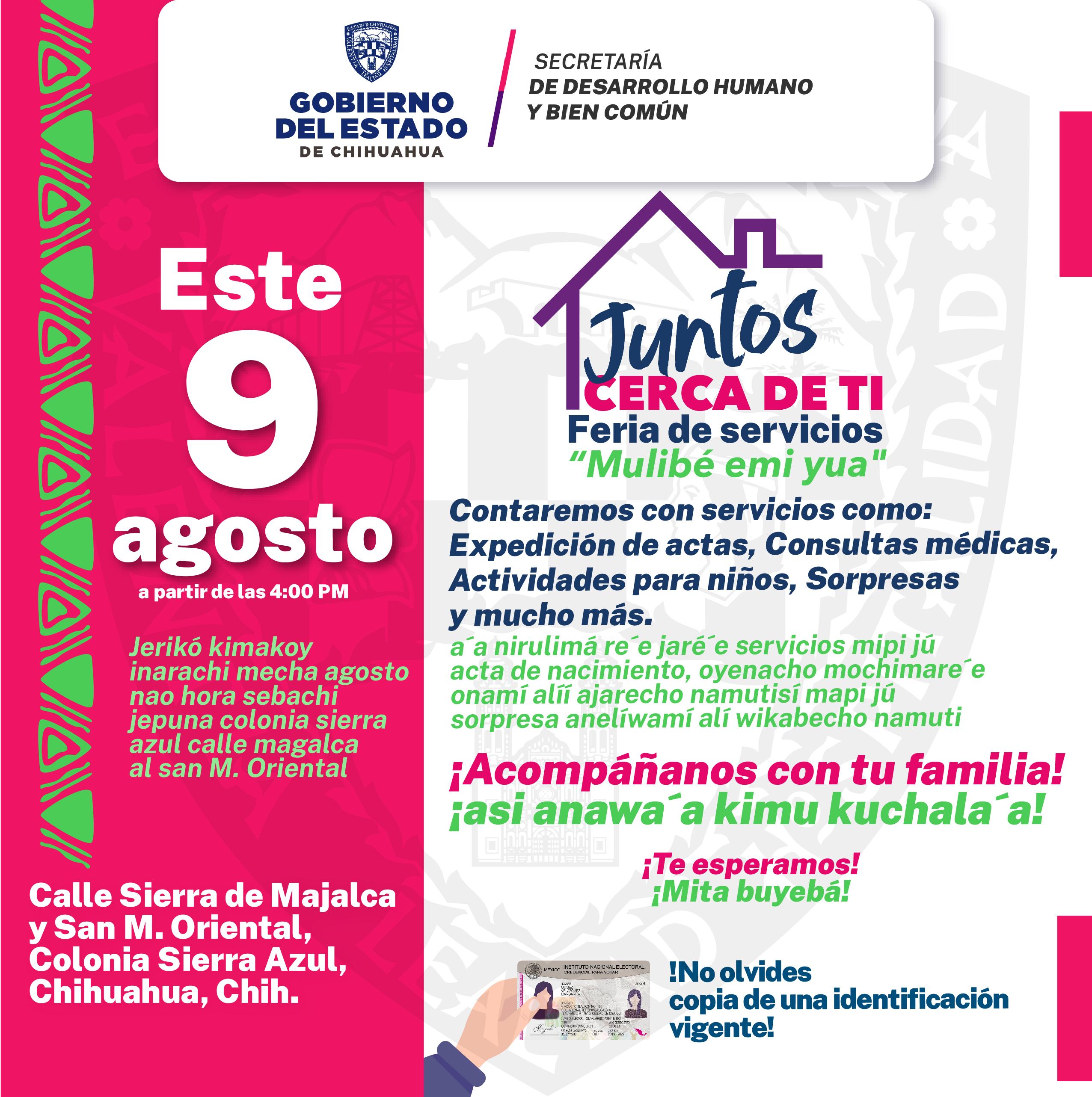 La Secretaría de Desarrollo Humano y Bien Común (SDHyBC) anunció que este viernes 9 de agosto, la feria "Juntos Cerca de Ti" llega a la colonia Sierra Azul, en la ciudad de Chihuahua, con el objetivo de acercar a la ciudadanía los servicios que ofrece el Gobierno del Estado.