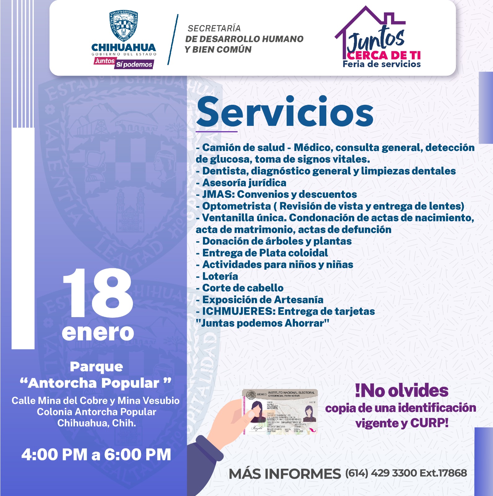 La Secretaría de Desarrollo Humano y Bien Común (SDHyBC), anunció que este jueves 18 de enero se reanudan las ferias de servicios gratuitos "Juntos Cerca de Ti", con la presencia del personal del Gobierno del Estado en la colonia Antorcha Popular, de la ciudad de Chihuahua.