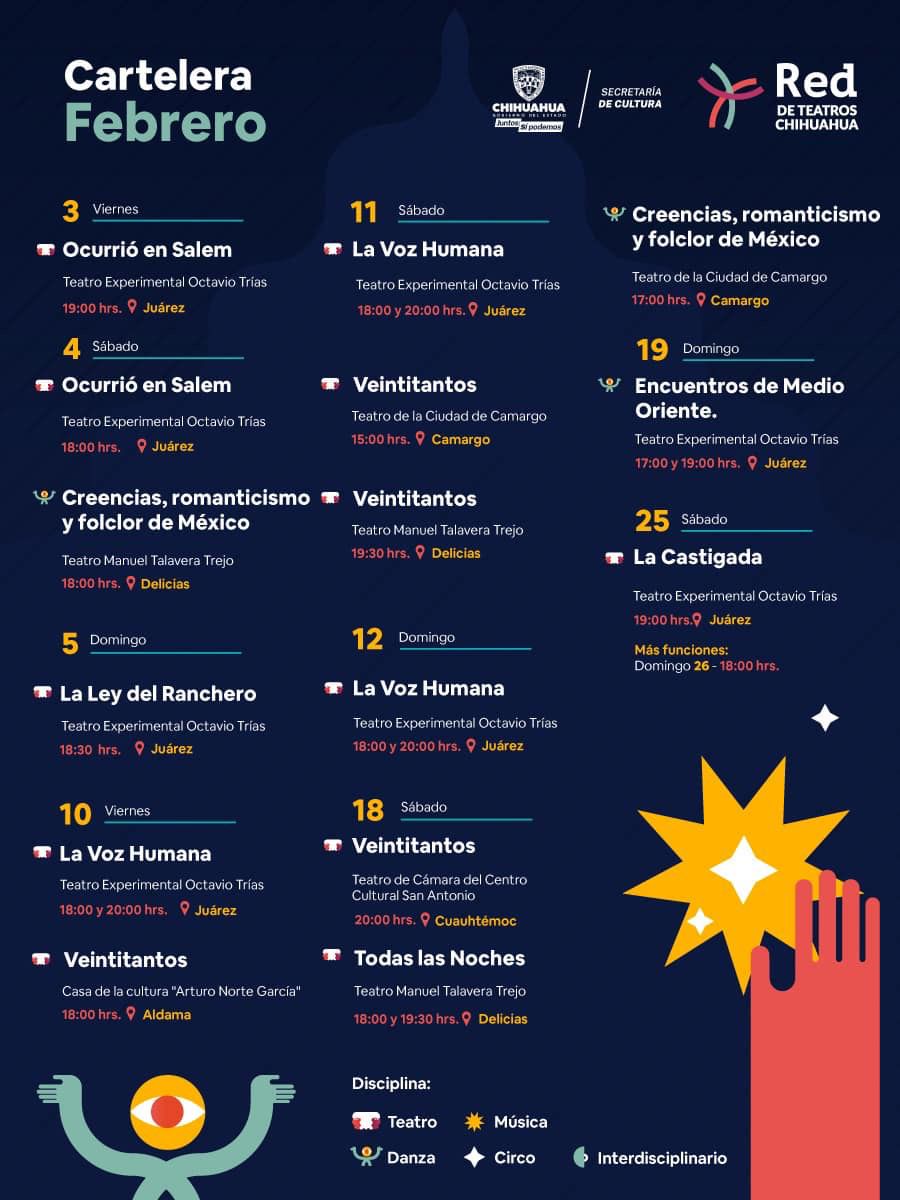 Con el objetivo de descentralizar los eventos culturales que hay en el estado de Chihuahua y fomentar el talento local, la Secretaría de Cultura del Estado de Chihuahua a través del programa Red de Teatros, invita a la serie de presentaciones que se realizarán durante el mes de febrero en los municipios de Ciudad Juárez, Cuauhtémoc, Delicias, Camargo y Aldama.