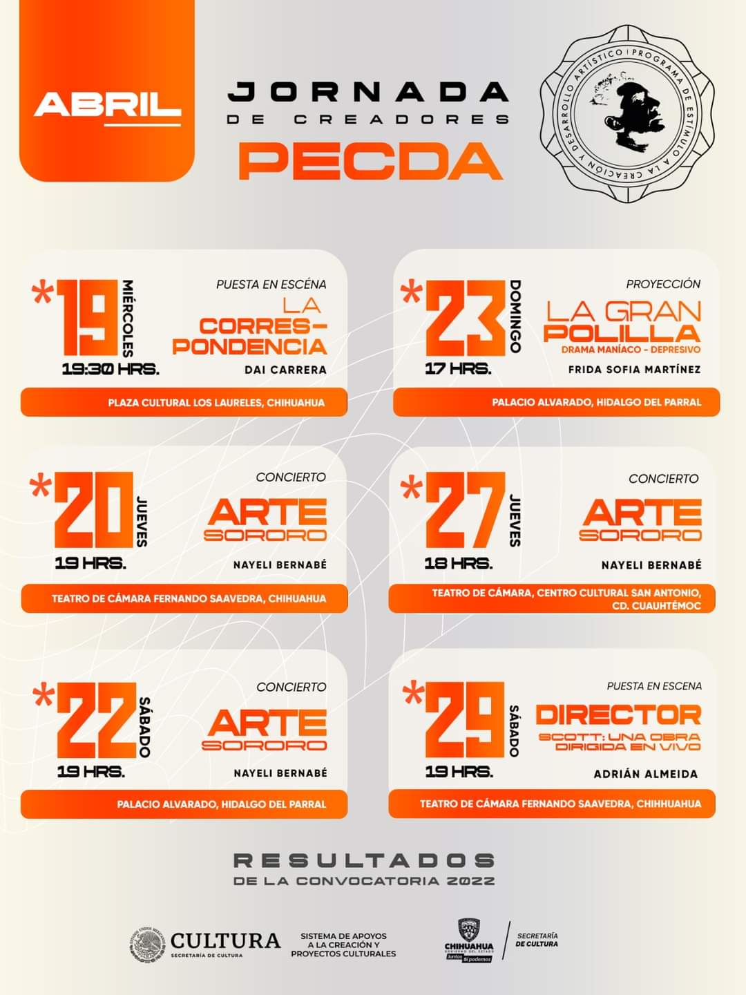 Con el propósito de apoyar el trabajo de creadoras y creadores chihuahuenses y abrir espacios para las manifestaciones artísticas, la Secretaría de Cultura invita a la Jornada de Creadores del Programa de Estímulo a la Creación Artística (PECDA), cuya programación se desarrollará durante los meses de abril y mayo en los municipios de Chihuahua, Hidalgo del Parral y Cuauhtémoc.