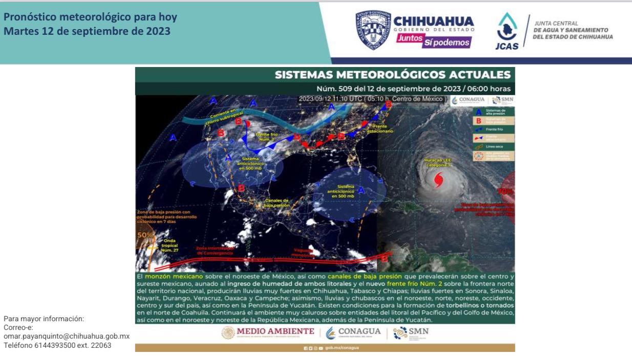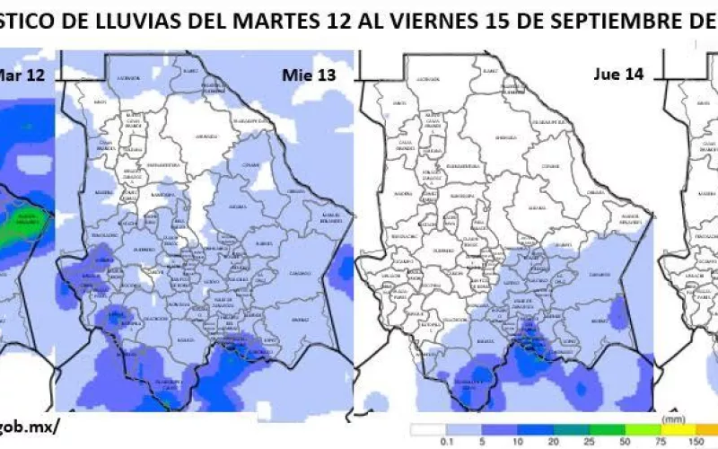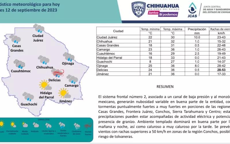 La dependencia informó que las lluvias de fuertes 25.1 a 50 mm en la zona este, incluidos El Oasis y Manuel Benavides; las lluvias de dispersas a moderadas con chubascos de 5.1 a 25 mm se prevén para las zonas norte, oeste, suroeste, centro, sureste y noreste, incluidos Juárez, Guadalupe, Ahumada, Palomas, Ocampo, Guerrero, Guachochi, Nonoava, Morelos, Guadalupe y Calvo, San Francisco de Borja, Cuauhtémoc, Chihuahua, Satevó, Julimes, Saucillo, La Cruz, Coyame y Ojinaga.