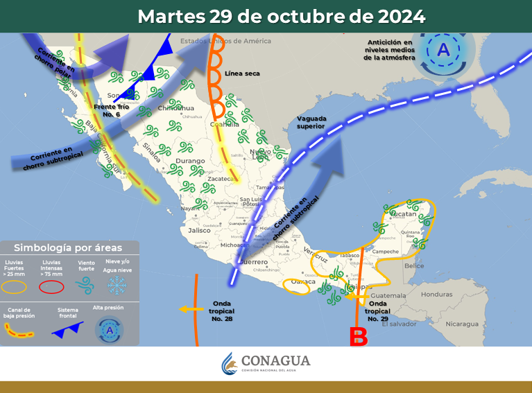 Además, para esta tarde noche de martes se pueden registrar precipitaciones aisladas en Madera, Guazapares, Maguarichi, Bocoyna, Urique, Batopilas, Morelos y Guadalupe y Calvo. Las lluvias pueden estar acompañadas de actividad eléctrica y caída de granizo.