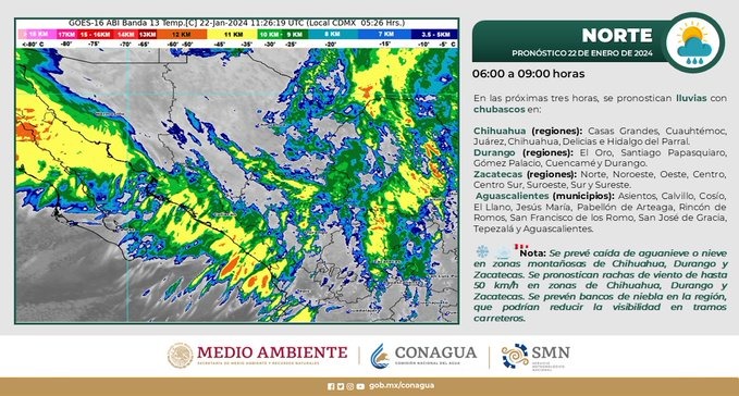 Dichas precipitaciones pueden estar acompañadas de aguanieve y nieve en las partes altas de la sierra, especialmente en Janos, Casas Grandes, Ignacio Zaragoza, Madera, Ocampo, Bocoyna, Guachochi, Cuauhtémoc y Chihuahua (Majalca).