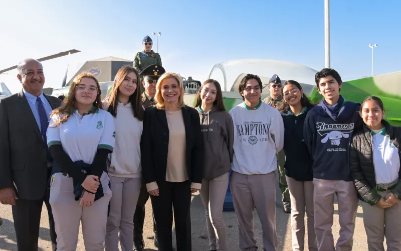 La gobernadora Maru Campos acudió como invitada de honor a la ceremonia de inauguración de la exposición militar “La Gran Fuerza de México”, en la que la Secretaría de la Defensa Nacional (Sedena) muestra a la ciudadanía parte de su equipo y esquema de trabajo.