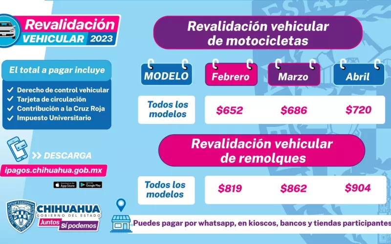 Para pagar se puede acudir a cualquier módulo de recaudación de rentas o bien, hacer uso de los medios alternos de pago como son tiendas de autoservicio, bancos participantes, kioscos, a través de mensaje en Facebook.com/shGobChih, mediante la página ipagos.gob.mx y también vía whatsapp al (614) 372-17-00.