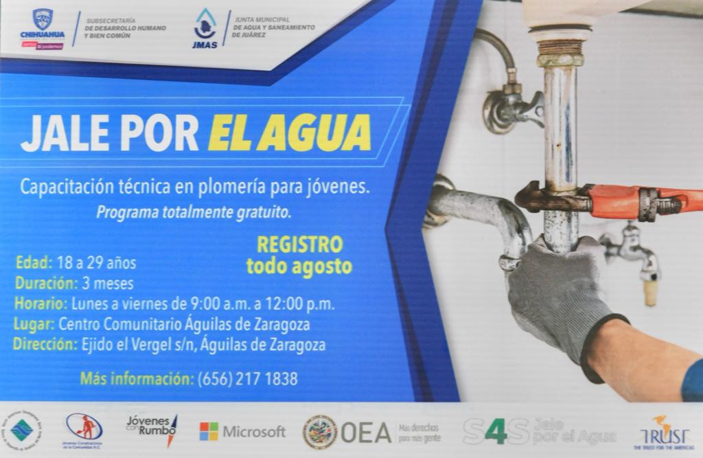 Con el objetivo de brindarles a los jóvenes capacitación para la inserción productiva en el sector del agua, el Gobierno del Estado a través de la Secretaría de Desarrollo Humano y Bien Común en conjunto con la Junta Municipal de Agua y Saneamiento, el Instituto de Capacitación para el Trabajo del Estado de Chihuahua (ICATECH), Centros Comunitarios Estatales y Jóvenes Constructores de la Comunidad Juárez ofrecerán de manera gratuita un curso de plomería.