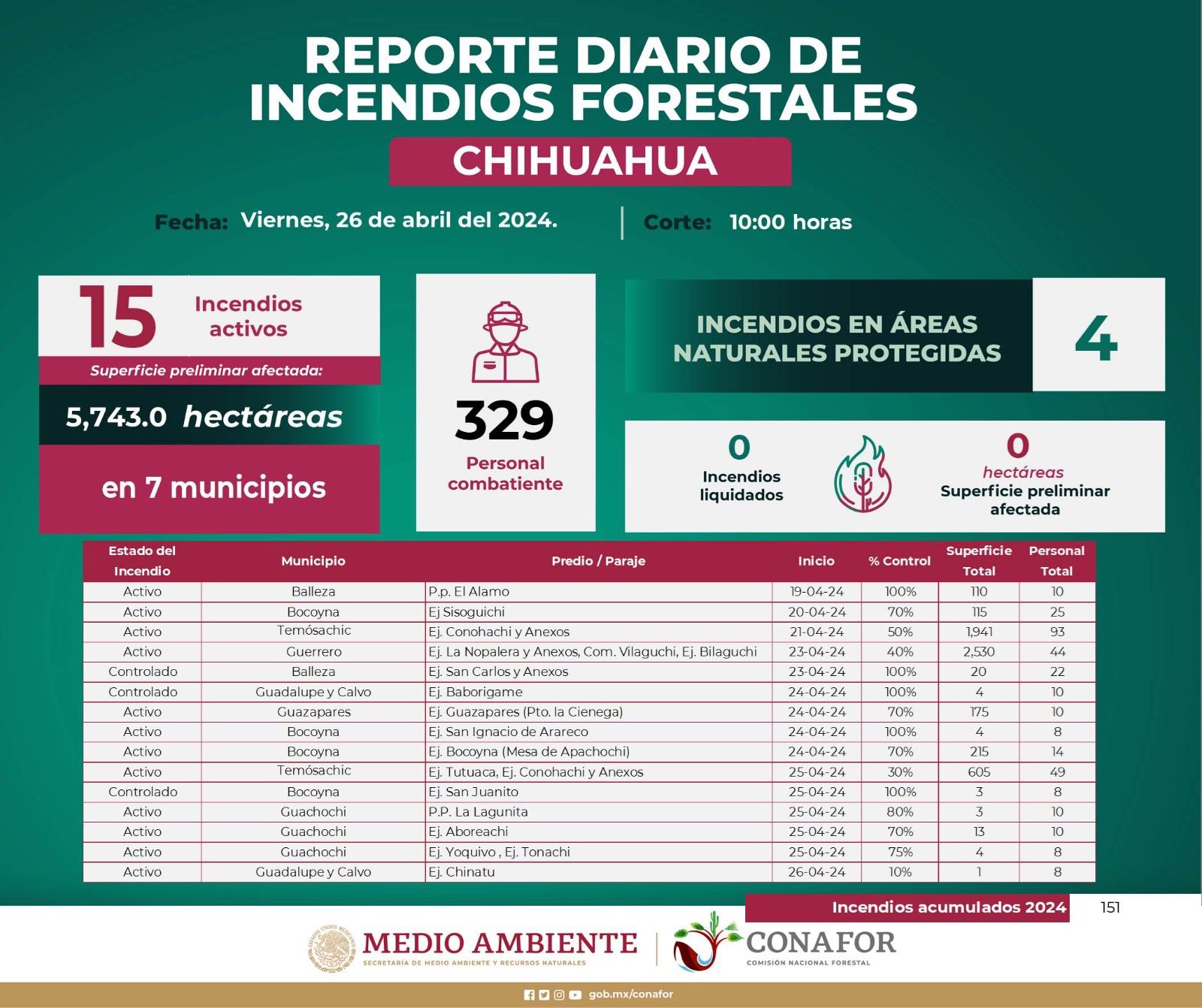 Un grupo de 320 brigadistas trabaja en el combate de un total de 15 incendios activos detectados en 7 municipios de la Sierra Tarahumara, de acuerdo con el último reporte emitido por la Comisión Nacional Forestal (Conafor).