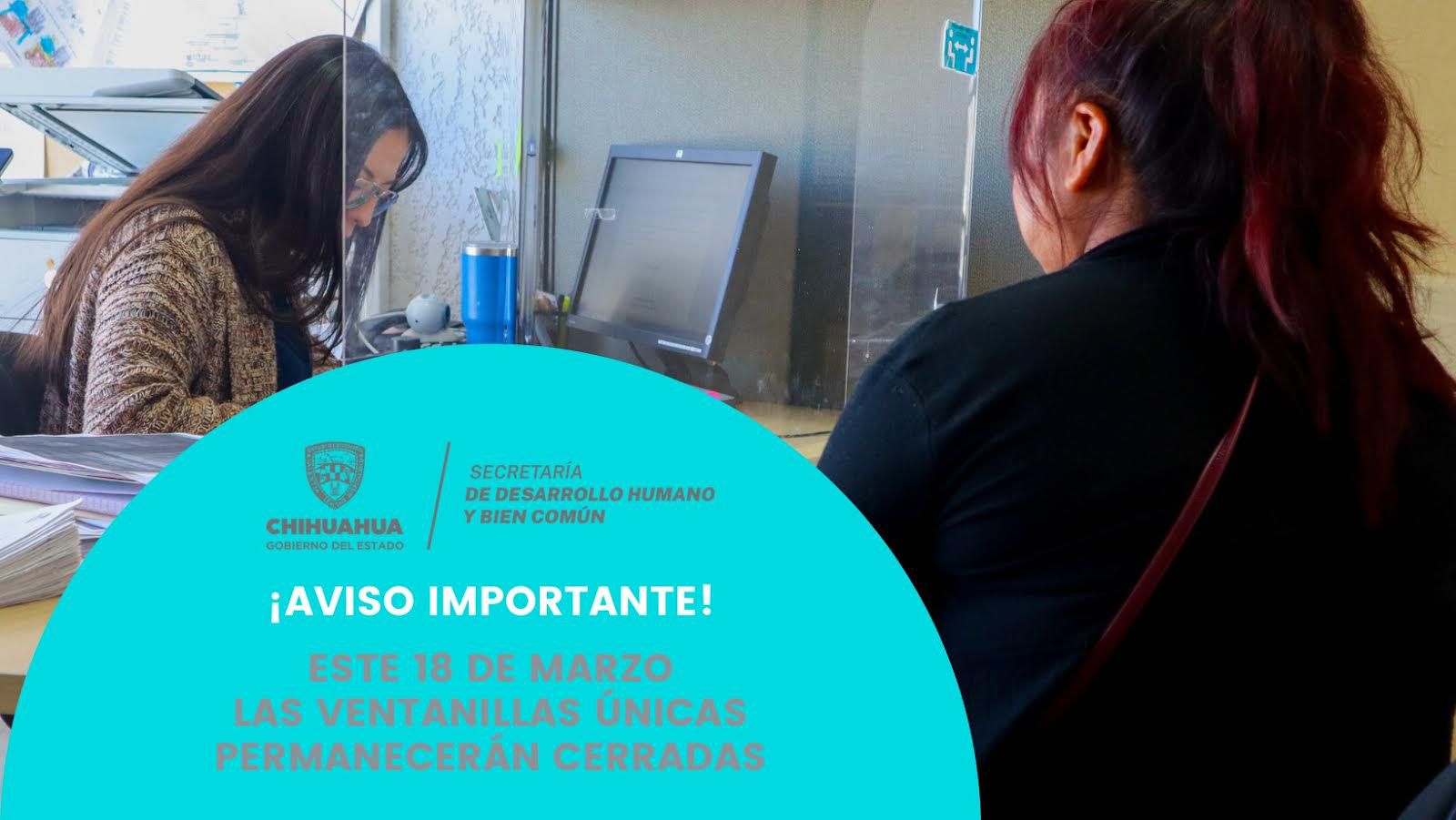 La Secretaría de Desarrollo Humano y Bien Común (SDHyBC) anunció que con motivo de la conmemoración del natalicio de Benito Juárez, mañana lunes 18 de marzo permanecerán cerradas las Ventanillas Únicas en los municipios de Chihuahua, Nuevo Casas Grandes e Hidalgo del Parral.