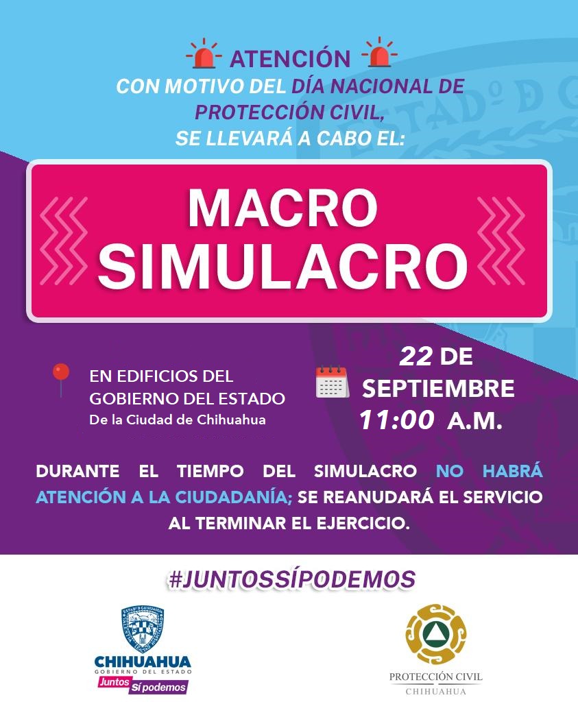 Debido a la realización de un macro simulacro de sismo este jueves 22 de septiembre, de las 11:00 a las 13:00 horas serán suspendidas las actividades en varias dependencias del Gobierno del Estado.