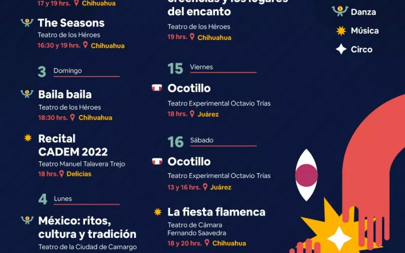 El Gobierno del Estado de Chihuahua, a través de la Secretaría de Cultura, invita a conocer la cartelera del Programa Red de Teatro 2022, conformada por funciones de danza, teatro y música, que se presentarán durante julio en municipios como, Chihuahua, Ciudad Juárez, Delicias y Camargo.