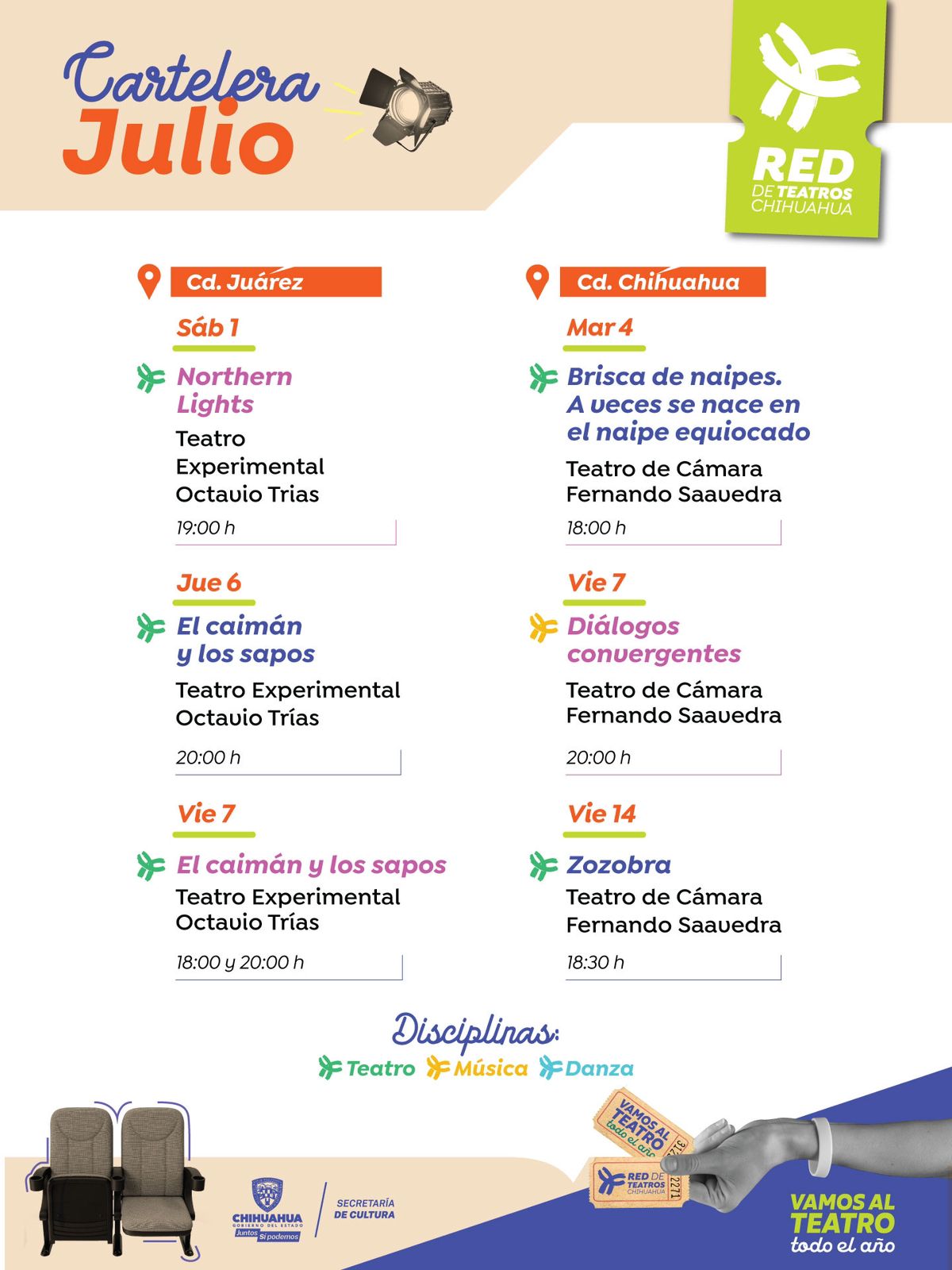 Con el objetivo de apoyar las artes escénicas locales, la Secretaría de Cultura del Estado de Chihuahua, invita a las presentaciones artísticas que ofrecerá el programa Red de Teatros durante el mes de julio en el municipio de Chihuahua y Ciudad Juárez.