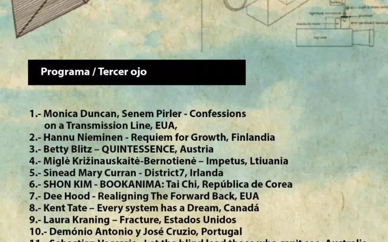 Este lunes se proyectan los filmes: "Requiem for Growth" de Finlandia, "Quimtessence" de Austria, "Impetus" de Lituania, "District7" de Irlanda, "Tai Chi" de la República de Corea, "Every System has a Dream" de Canadá, "Demonio Antonio y José Cruzio" de Portugal; "Let the blind leas those who can't see", "An introduction to the Theory of Eclipses" de Australia; "Confessions on a Transmission Line", "Realingnig the forward back" y "Fracture", de Estados Unidos.