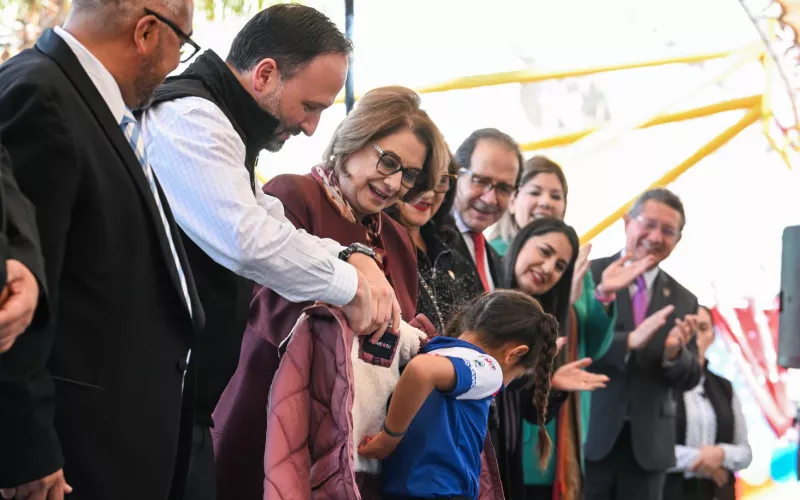 En el marco de la presentación de este esquema, las autoridades entregaron chamarras del Programa “Juntos sin Frío” a los 187 estudiantes e inauguraron dos nuevas aulas del Colegio Salesiano de Juárez.