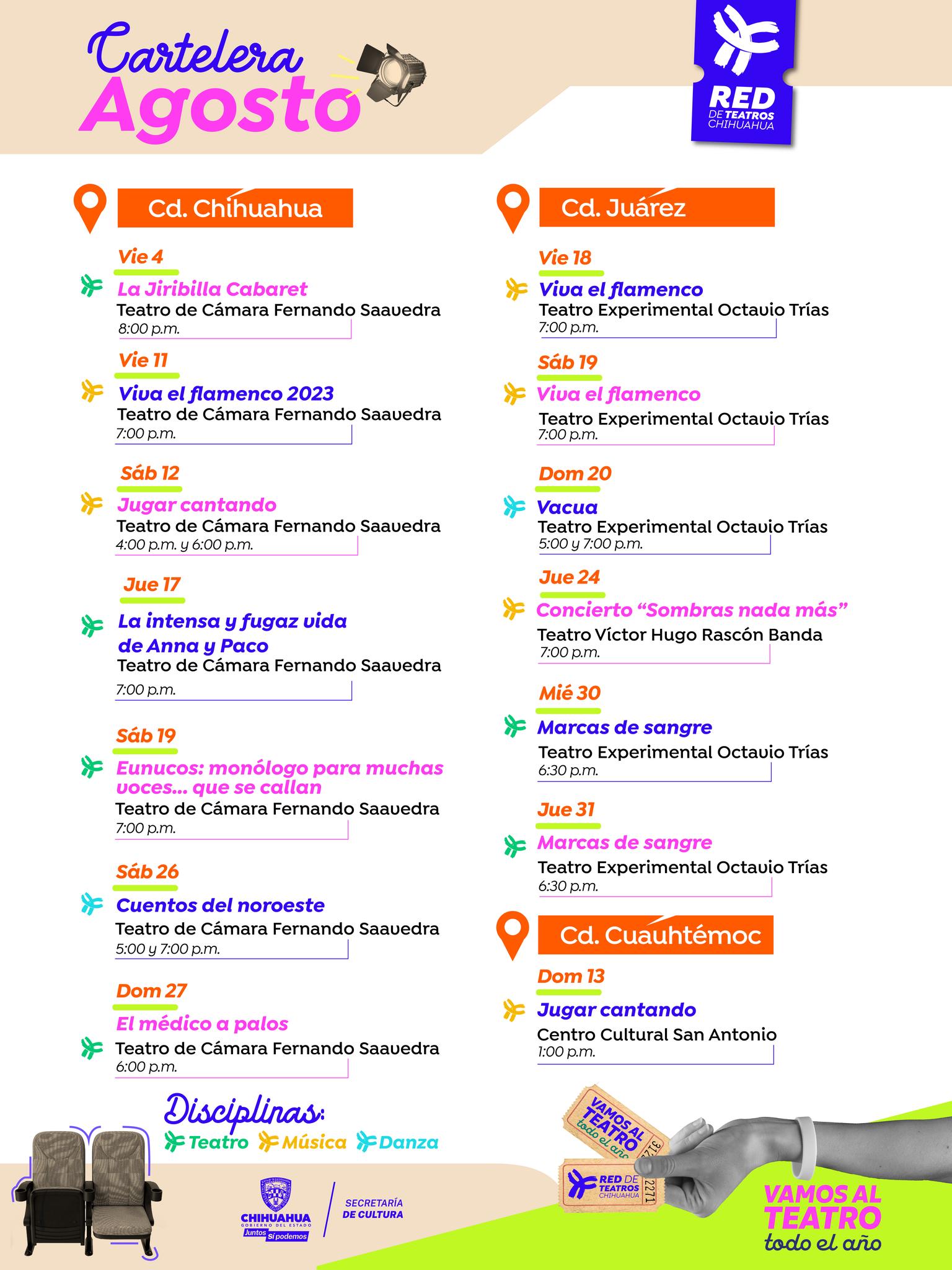 Con el objetivo de impulsar las artes escénicas del talento local, la Secretaría de Cultura del Estado de Chihuahua, invita a la programación de Red de Teatros que tendrá en el mes de agosto en la ciudad de Chihuahua, Ciudad Juárez y Cuauhtémoc.