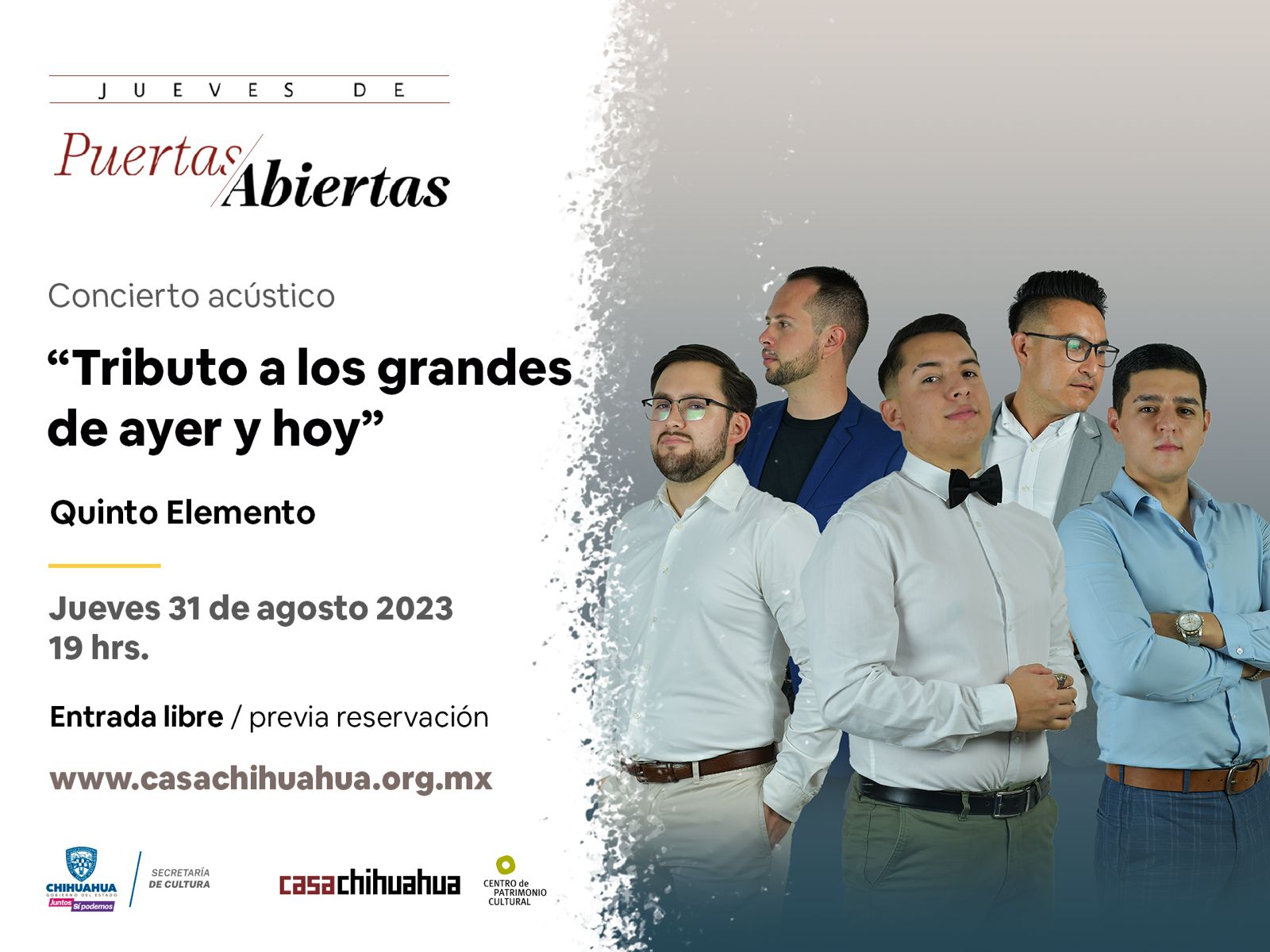 El próximo 31 de agosto a las 19:00 horas, Casa Chihuahua recibirá al grupo Quinto Elemento en uno de sus Jueves de Puertas Abiertas, para presentar el concierto “Tributo a los grandes de ayer y hoy” con temas de Rocío Dúrcal, Javier Solís, Joan Sebastian, entre otros cantantes.