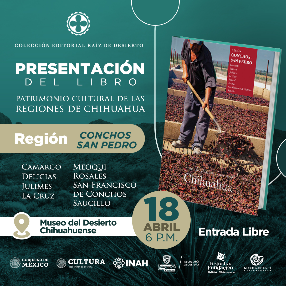 Este martes 18 de abril en punto de las 18:00 horas, en el Museo del Desierto Chihuahuense (MUDECh) de la ciudad de Delicias, se llevará a cabo la presentación del libro “Patrimonio Cultural de las Regiones de Chihuahua. Región Conchos-San Pedro”.