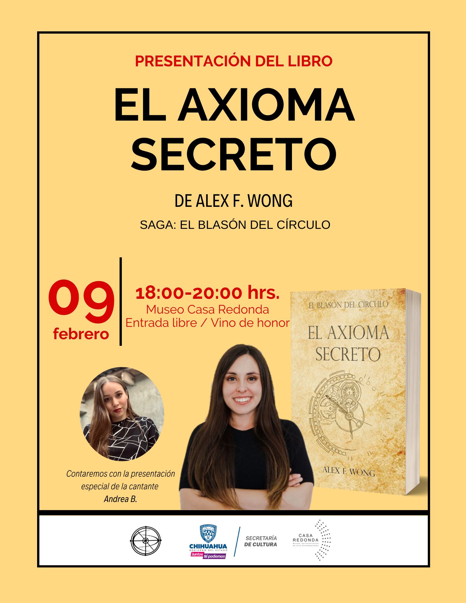 En apoyo al fomento a la lectura y la difusión del trabajo de creadoras y creadores literarios, y como parte del programa de actividades culturales en recintos museísticos, la Secretaría de Cultura del Estado de Chihuahua invita a la presentación del libro “El axioma secreto” de la escritora Alex F. Wong, evento que se realizará de forma gratuita en Casa Redonda, Museo Chihuahuense de Arte Contemporáneo, el jueves 9 de febrero a las 18:00 horas.