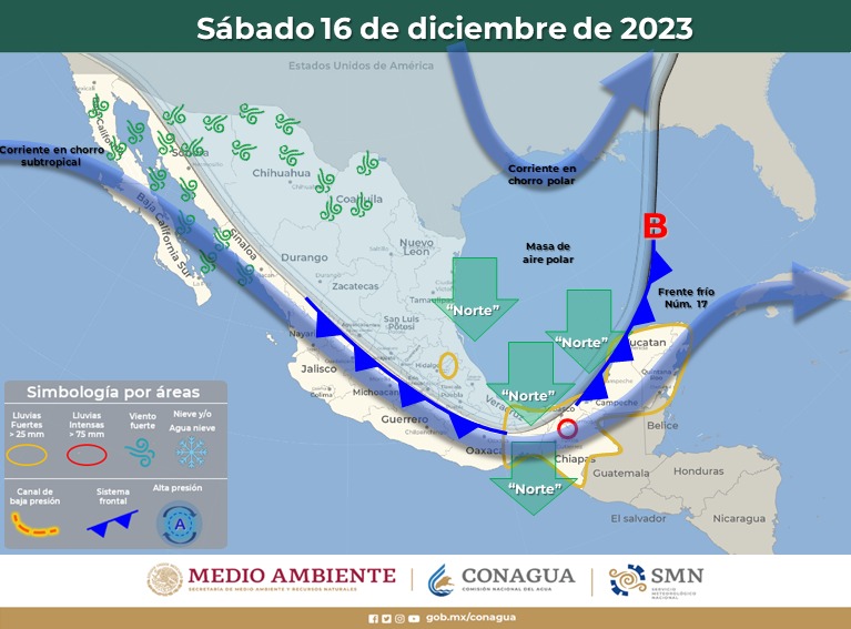 Estas condiciones son ocasionadas por el paso del frente frío número 17 y la masa de aire polar que tiene asociada, que favorece un ambiente de frío a muy frío por la mañana, templado por la tarde y temperaturas de muy frías a gélidas en la región serrana.
