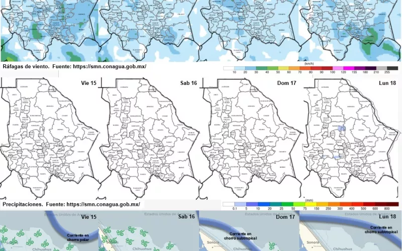 Se espera además que la velocidad de los vientos varíe de los 5 a los 20 kilómetros por hora (km/h), con rachas que pueden alcanzar los 35 km/h en las zonas del suroeste y sureste del estado, particularmente en los municipios de Guachochi, Balleza y Meoqui. Al momento se tiene nula posibilidad de lluvias en la entidad.