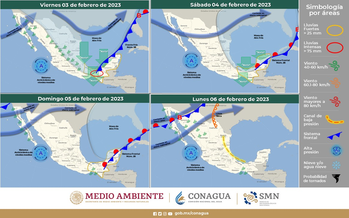 Mientras para el próximo domingo 5 la aproximación del nuevo Frente Frío número 30 ocasionará un ambiente frío por la mañana y de templado a poco caluroso por la tarde, con rachas de viento que pueden superar los 45 km/h en Janos Casas Grandes, Namiquipa, Guerrero, Carichí, Cuauhtémoc y Majalca.