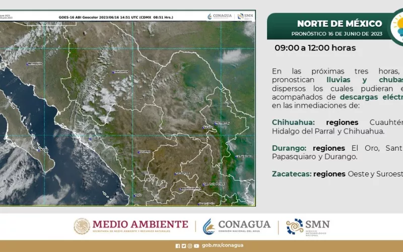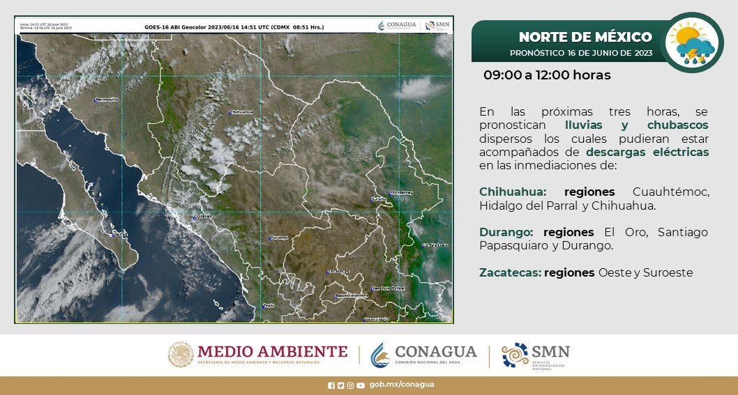Asimismo, se pueden presentar lluvias ligeras sobre municipios como Guadalupe y Calvo, Coronado, López, Jiménez, Bachiniva, Guerrero, Carichí, Balleza, Cuauhtémoc, Riva Palacio, Chihuahua, Santa Bárbara, Matamoros, Allende, Camargo y La Cruz.